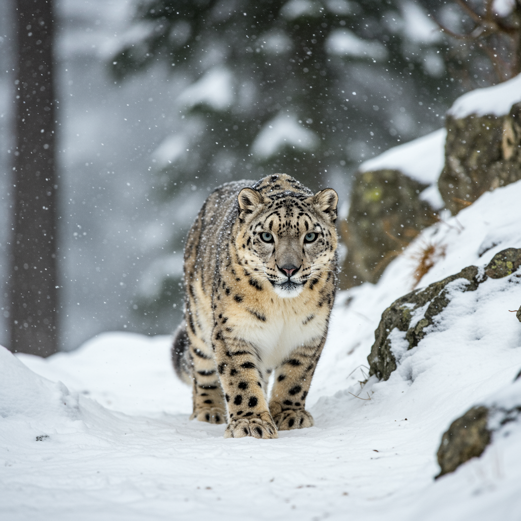 A captivating medium shot of a snow leopard stealthily navigating through a snowy, rocky mountain forest on an overcast day, its entire body visible amidst the wintery landscape. The scene captures the leopard's piercing gaze directed towards the viewer, exuding an intense, predatory focus. Each detail is sharply rendered in high resolution, from the intricacies of its hyper-detailed eyes to the texture of its thick fur. Natural lighting enhances the drama of the snowy expanse, adding to the vivid realism of this exceptional wildlife photograph.