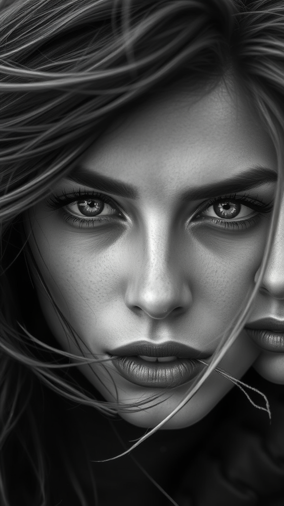 A captivating monochrome image of women in motion, capturing their intense gaze and hauntingly beautiful expressions. Their eyes tell layered stories, rich with emotion and depth. The composition features jagged elements reminiscent of western portraiture, with a loose and fluid style, evoking a sense of dynamic energy and timeless grace.