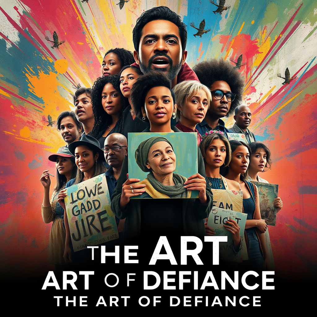 A captivating movie poster for "The Art of Defiance" showcases a diverse ensemble of artists and cultural icons, each presenting a distinct piece of art that embodies their unique causes and fights. The background bursts with dynamic and vivid colors, blending abstract and realistic art styles seamlessly. The atmosphere of the poster is uplifting and empowering, highlighting the transformative power of art and creativity as a force against challenges.