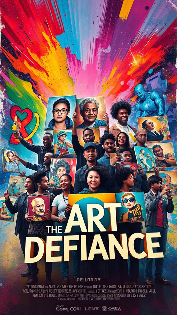 A captivating movie poster for "The Art of Defiance" showcases a vibrant assembly of artists and cultural icons, each brandishing a distinct piece of art that embodies their individual movements and challenges. The background bursts with an energetic and vivid color palette, blending abstract and realistic art styles harmoniously. The atmosphere of the poster is both uplifting and motivating, celebrating the transformative force of art and creativity in overcoming obstacles.