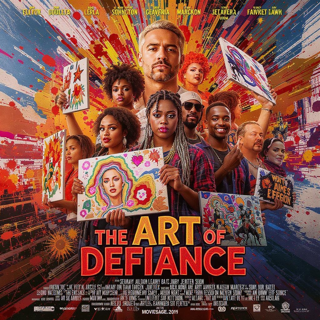 A captivating movie poster for "The Art of Defiance" showcases a diverse assembly of artists and cultural trailblazers, each brandishing a distinctive piece of art that represents their individual movements and battles. The backdrop explodes with a dynamic and vibrant color scheme, blending both abstract and realistic art styles. The overall aura of the poster exudes inspiration and empowerment, honoring the strength of art and creativity in overcoming challenges.