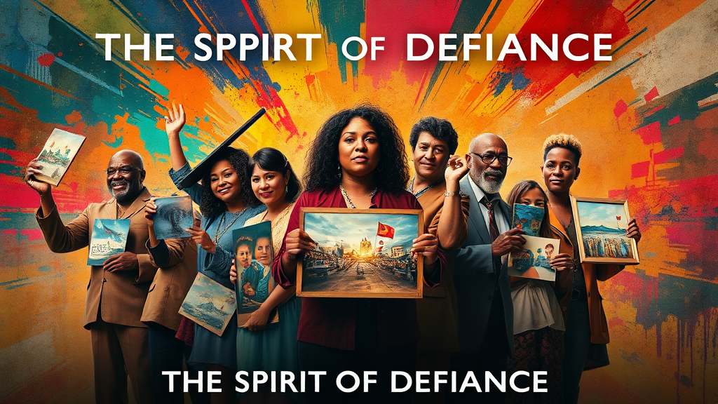 A captivating movie poster for "The Spirit of Defiance" showcases a diverse ensemble of artists and cultural icons, each holding a distinctive piece of art that represents their unique movements and battles. The backdrop bursts with a vibrant and dynamic color scheme, blending abstract and realistic art forms. The poster exudes an inspiring and uplifting atmosphere, celebrating the transformative power of art and creativity in overcoming challenges.