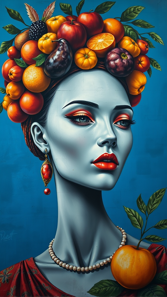 A captivating mural depicts a woman with porcelain skin, reminiscent of a goddess, set against a rich azure backdrop. Her head is crowned with an abundant array of vibrant fruits, each piece meticulously detailed, nodding to the vibrant richness of Benin art. The style is an intricate fusion, drawing inspiration from Ingrid Baars' evocative forms and Paolo Veronese's grandiose, detailed settings. The portrait exudes the depth of chiaroscuro, the play of light and shadow adding a three-dimensional feel, with elements gracefully melting into each other, creating a harmony of diversity like a melting pot. The overall composition is rendered in an ultra-high-definition 32k resolution, capturing every subtle nuance and texture, remaining true to a raw, yet refined style.