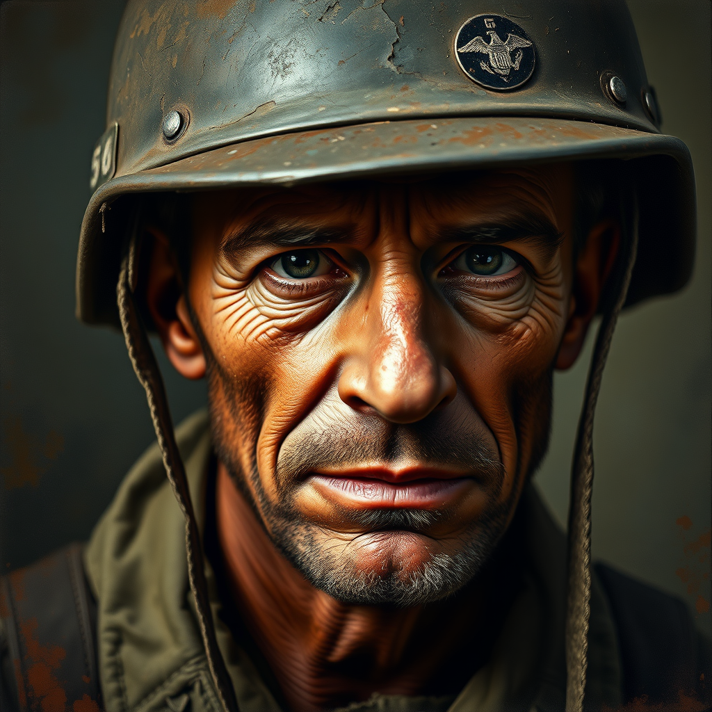 A captivating oblique view portrait of a seasoned World War II U.S. Marine soldier, his weathered face brimming with years of resilience. The soldier wears a well-worn helmet, a symbol of countless battles faced. This beautifully crafted painting, inspired by the styles of Greg Rutkowski and Magali Villeneuve, features an intricately detailed face, capturing the depth of his determined eyes and the subtle nuances of his furrowed brow. The play of light and shadow across his features highlights not only the passage of time but also his enduring spirit, while the muted tones of the background evoke a sense of historical depth and solemnity.