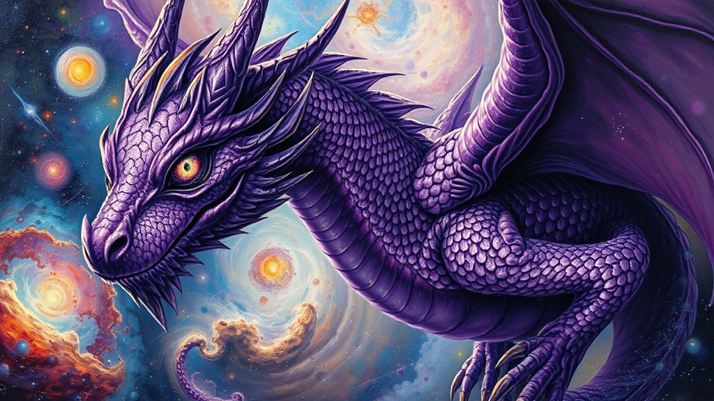 A captivating oil painting featuring a purple dragon with shimmering scales, portrayed using heavy impasto techniques, merges elements of cosmic horror and surreal beauty. The dragon's eyes glimmer with an otherworldly luminescence, evoking a sense of ancient knowledge and mystery. In the background, distant galaxies and nebulae swirl, their colors blending seamlessly with the dragon's skin, creating an ethereal and foreboding atmosphere. Detailed textures and intricate patterns adorn the dragon's wings and body, reminiscent of elegant and sophisticated concept art, evoking the influence of master artist Craig Mullins. The composition is both haunting and mesmerizing, drawing the viewer into its enigmatic depths.