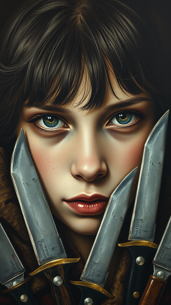 A captivating oil painting portrait of a girl with hauntingly empty eyes, her gaze intense and penetrating. The texture has a grainy, tactile feel, inspired by the masterful style of Diego Velazquez. Surrounding her are an array of knives, adding an intriguing tension to the composition. The overall aesthetic embraces a raw, unrefined quality, with each brushstroke embodying a sense of rough elegance and personal expression.
