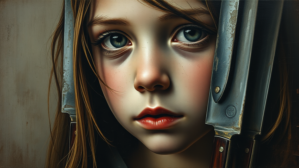 A captivating oil painting portrait of a young girl with hauntingly empty eyes and a distant gaze, featuring a rough, grainy texture. The style is reminiscent of Diego Velazquez, incorporating an array of knives subtly interwoven into the composition. The atmosphere is raw and evocative, with an elongated 9:16 aspect ratio that enhances the enigmatic and surreal quality of the piece.