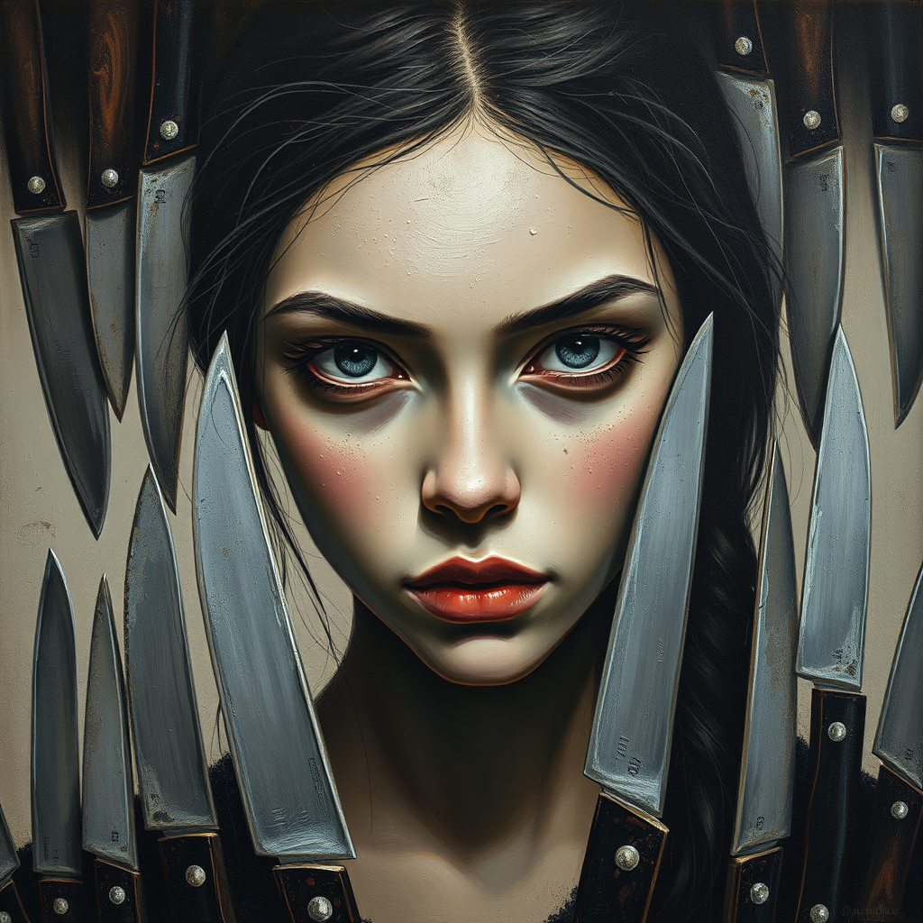 A captivating oil painting portrait of a young woman with empty, enigmatic eyes, featuring a grainy texture. The piece is a minimalist avant-garde creation with intricate details, surrounded by an array of knives. The artwork exudes a rough, dark mood, offering a striking contrast with its elongated dimensions.