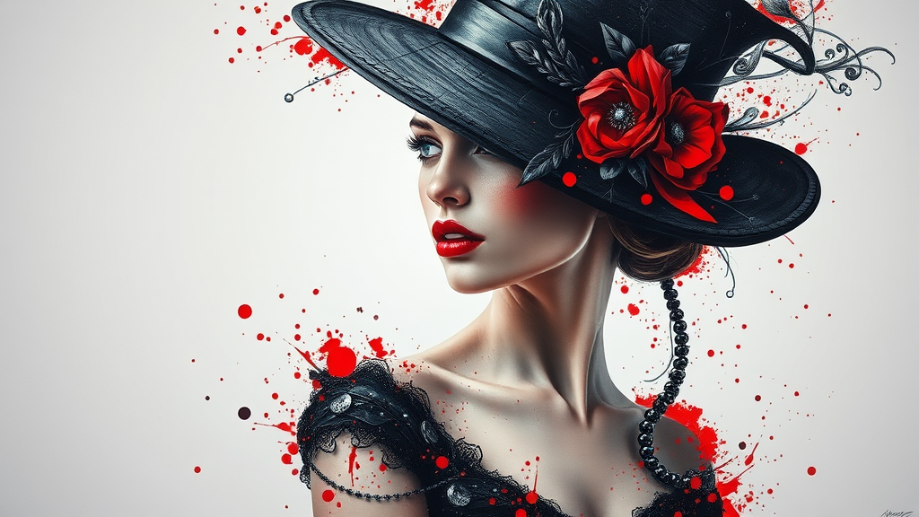 A captivating painting of a woman adorned with an elegantly crafted black hat, exuding an aura of steampunk charm. Her figure, twisted in a graceful figura serpentinata pose, is enveloped in a dramatic play of dark silver and vibrant red tones. Bold splashes of white and red accentuate her handsome features, creating striking contrasts against a pristine white background, embodying a sophisticated blend of color splash artistry and contrasting values.