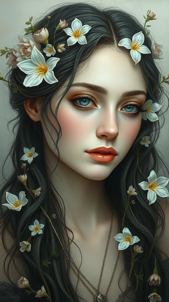 A captivating painting of a woman adorned with delicate flowers woven into her hair, embodying the ethereal beauty reminiscent of James Jean and WLOP. Her hauntingly beautiful presence is captured in a fantasy portrait, drawing inspiration from the tragic yet enchanting essence of Ophelia. With intricate and realistic details, the artwork showcases a fusion of styles by Loish and WLOP, creating an iridescent and imaginative realism. The piece reveals a mesmerizing blend of colors, akin to an intricate oil painting, and captures the beautiful complexity of a fantasy portrait in the evocative style of Anna Dittmann.