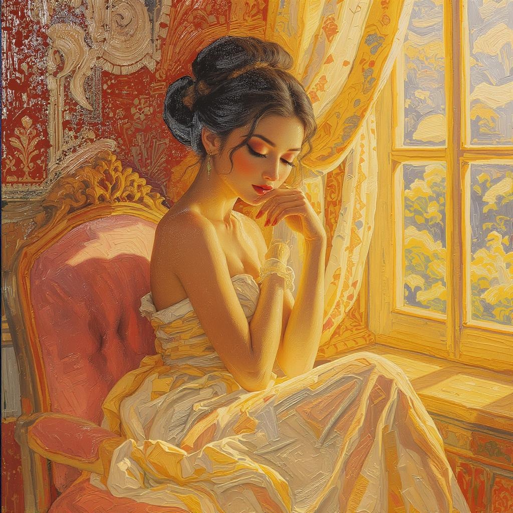 A captivating painting of a woman seated by a sunlit window, her serene expression captured with playful intricacy and rich texture. The canvas showcases a heavy impasto technique, enhancing the depth and beauty of her features. The scene exudes a romantic flair, drawing the viewer into an intimate close-up that elicits awe at her elegance. The composition is bathed in warm hues, with flowing details that celebrate the timeless allure of femininity.