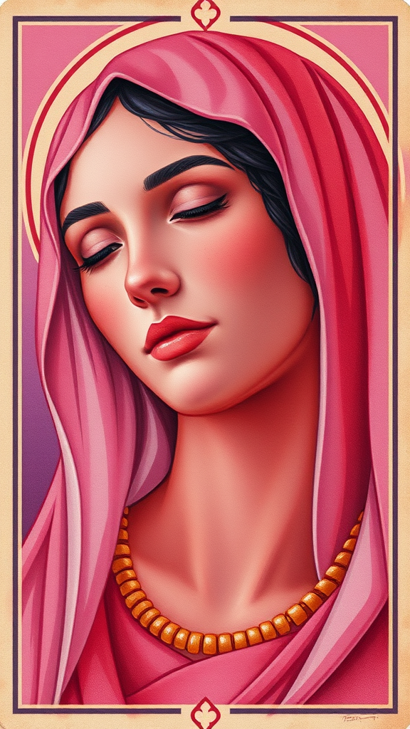 A captivating painting of Mary, where light red and purple hues gently merge, embodying the essence of a tarot card with intricate, realistic facial features reminiscent of Haifa Zangana's style. It draws upon the art of Tonga, showcasing a masterful attention to detail, subtly inspired by Ann Stookey's work. The composition maintains a unique artistic rendering, balancing creativity and traditional charm, while adhering to an aspect ratio of 105:128.