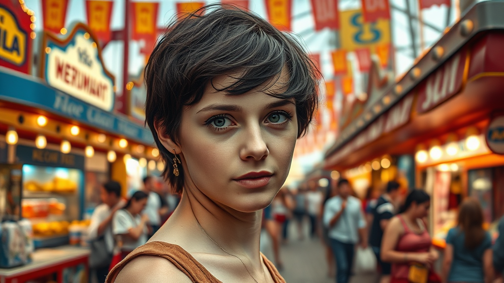 A captivating photo of Daisy Ridley at an amusement park captures her looking directly at the camera, her short dark hair adding to her charm. The bustling scene features merchant stalls offering an array of foods and souvenirs, while vibrant colorful banners flutter above the spacious walkways. The image, distinguished by sharp focus and award-worthy composition, showcases professional portrait photography with dramatic lighting reminiscent of the styles of WLOP, Jeffrey Simpson, Antonio J. Manzanedo, and Greg Rutkowski. The scene is further enriched by a playful artistic twist, with a subtle illustration quality that adds depth and character. The photograph captures multiple views and emotions subtly woven into the atmosphere, with a creative nod to surreal elements such as the presence of six fingers in the crowd, adding a touch of whimsy. The overall composition maintains a balance of joyful chaos and artistic flair, creating a truly memorable and captivating image that stands out as a unique artistic expression.