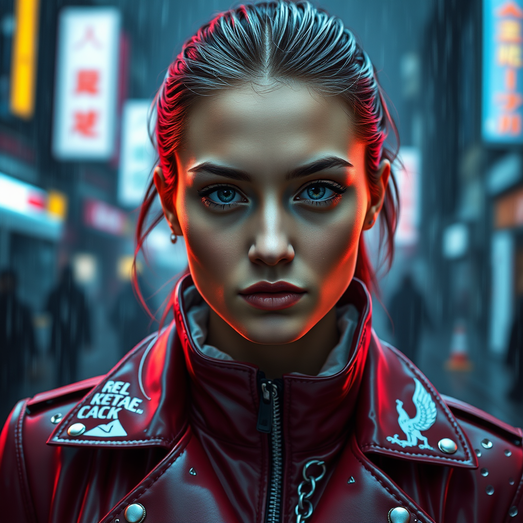 A captivating portrait centered on a European young woman, exuding a sense of allure and strength amidst a stormy rain-soaked backdrop. She dons a striking movie-style jacket coat, embodying the essence of futuristic sci-fi fashion blended seamlessly with royal attire influences. Her visage is flawlessly crafted, featuring a perfect face with a sharp chin and meticulously detailed features, designed to captivate the viewer. The composition is reminiscent of the artistic styles of Ismail Inceoglu, Dragan Bibin, Hans Thoma, and Greg Rutkowski, with elements of Alexandros Pyromallis' and Rene Magritte's whimsical touches. The atmosphere is steeped in a cyberpunk aesthetic, evoking the neon-lit allure of Neo-Tokyo and the synthwave age. In the spirit of Bladerunner, the scene captures a futuristic ambiance with low-emission neon glows, marrying the visual tension of sci-fi with imaginative fashion elements. The image cleverly avoids imperfections, maintaining realistic anatomy and proportions, while ensuring an immersive experience free from distractions of clones, mutations, or distortions, encapsulating a vision that is clear and purposefully crafted.