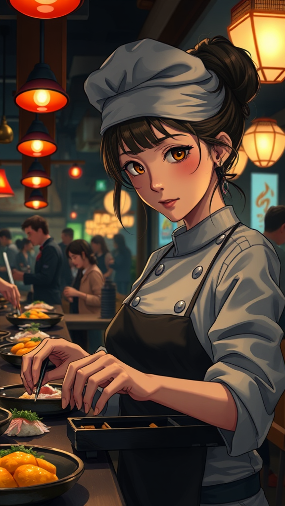 A captivating portrait depicts a female chef expertly crafting sushi at a bustling nighttime restaurant. The artwork carries an anime-inspired style reminiscent of Lois van Baarle's work. The scene captures the dim, atmospheric lighting characteristic of a busy sushi bar at night. Although her figure is elegantly framed, subtle imperfections and distortions typical of low-resolution anime art are noticeable—such as softly blurring lines and minor anatomy quirks. Her countenance exudes focus and creativity, with her eyes appearing almost luminescent against the ambient light. Despite the warmth of the image, elements like minor JPEG artifacts and an artist signature linger in the background, lending authenticity to the piece.