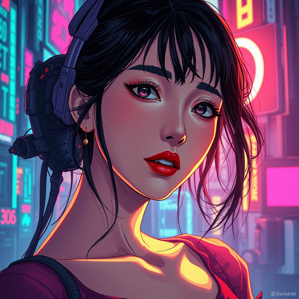 A captivating portrait in the style of Ghibli and Akihiko Yoshida, featuring a woman amidst a cyberpunk, synthwave sci-fi backdrop. She is illuminated by soft light, showcasing finely detailed, elegant features. The art is exceptionally detailed, capturing the essence of perfect anime art. The scene is infused with vibrant synthwave elements, integrating a futuristic ambiance. Despite the charm, subtle imperfections like minor text errors, slight anatomical distortions, and low-resolution hints subtly intrude, adding uniqueness. Vivid yet subtly flawed, the portrait remains mesmerizing, balancing beauty with an intentional touch of surreal digital imperfections.