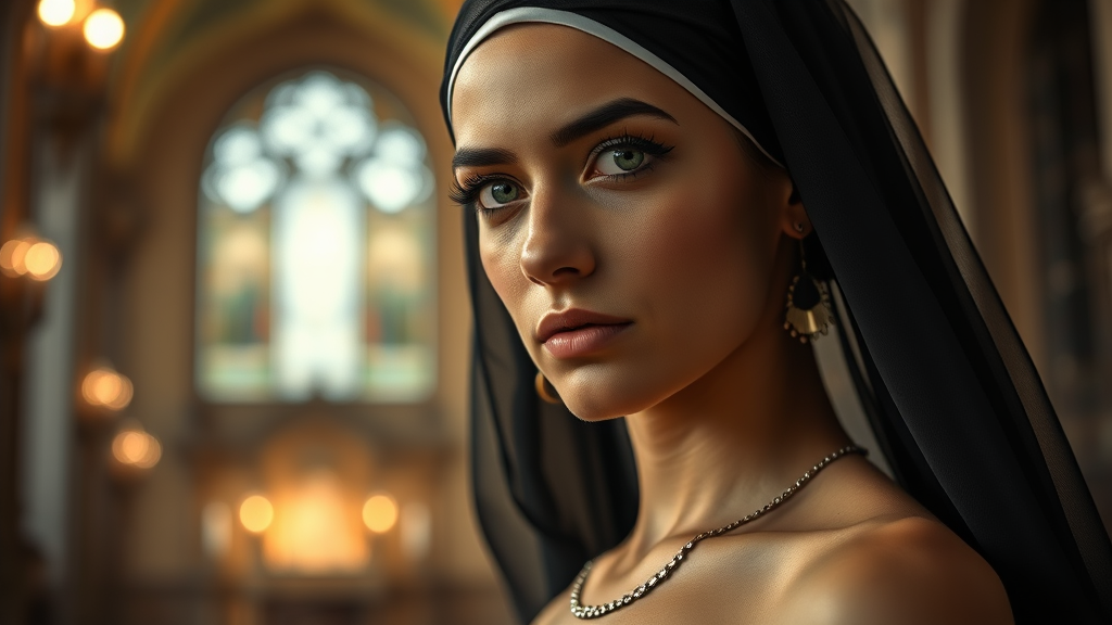 A captivating portrait inspired by the works of Nadav Kander and Annie Leibovitz, featuring a beautiful Spanish widow with a black veil, her face aligned with the golden ratio. The scene is framed in dramatic lighting akin to CinémaScope, highlighting her confident expression and expressive eyebrows. Her large, bright eyes and angelic face exude a sense of grace, adorned with a simple earring and necklace. She wears a strapless dress, standing against a backdrop of softly glowing candlelit church, the bokeh creating an ethereal atmosphere. The portrait, highly detailed, embodies the notion that the world is beautiful, capturing a moment of sad elegance and serene strength.