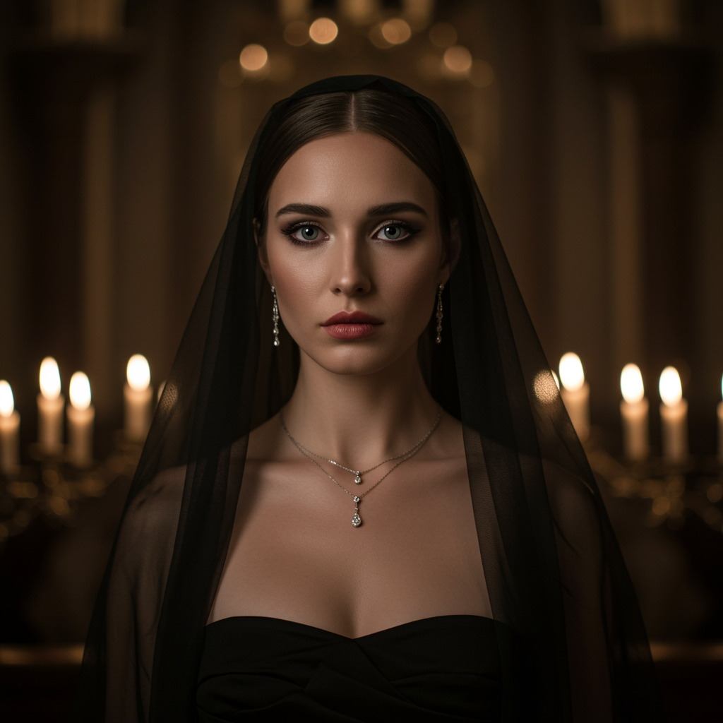 A captivating portrait inspired by the works of Nadav Kander and Annie Leibovitz, featuring a graceful Spanish widow with a black veil, her presence embodying sad elegance. Her face is framed with expressive eyebrows and lovely, large, bright eyes that reflect a world full of beauty. The composition follows the golden ratio, with dramatic lighting accentuating her angelic features. She wears a simple yet elegant earring and necklace set, adding a touch of understated glamour. The setting is a cinematic church illuminated by the soft, flickering glow of candles, creating a bokeh effect in the background. Her confident expression and strapless attire contribute to an image that is both timeless and intricately detailed.