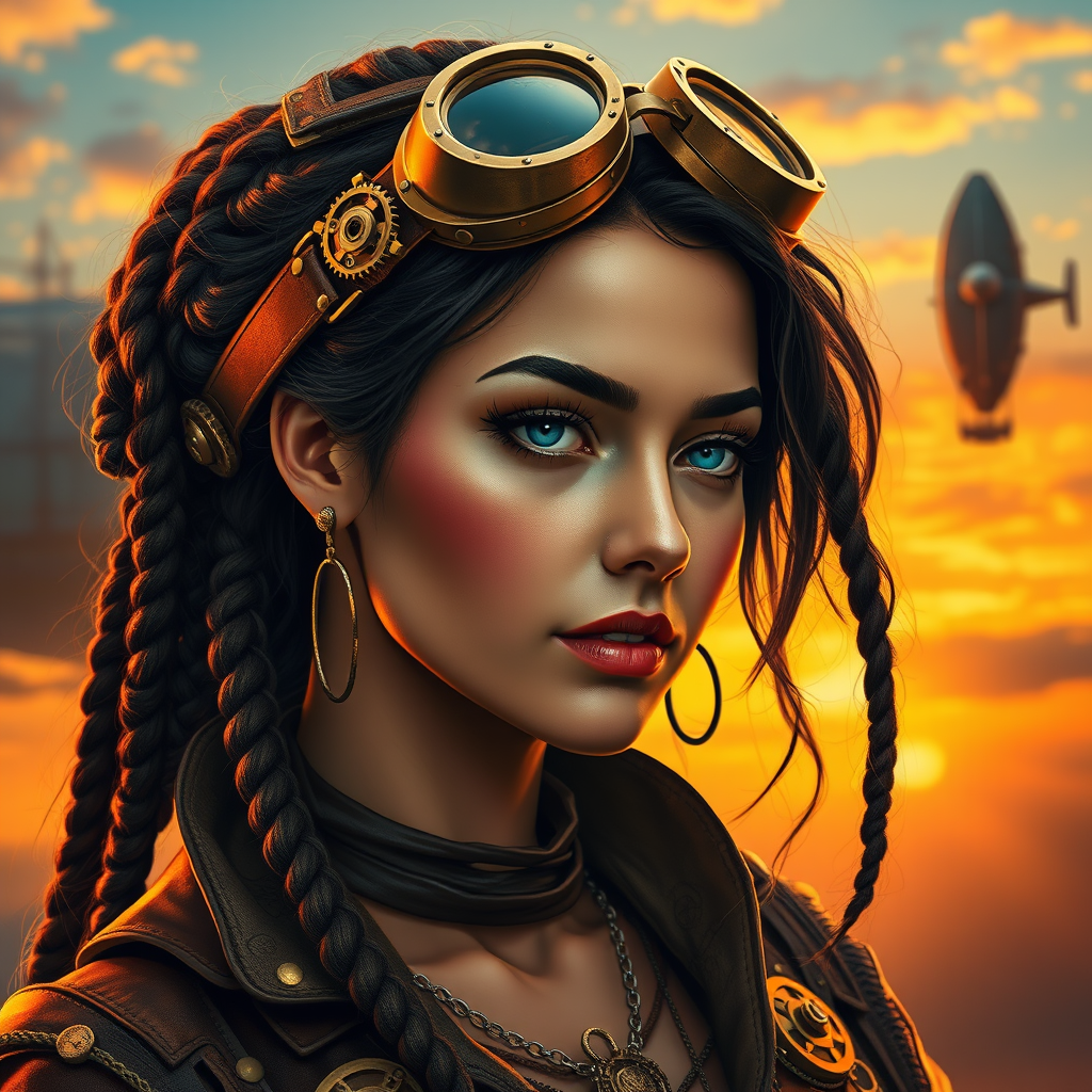 A captivating portrait of a beautiful female steampunk inventor with an airship setting, bathed in the warm glow of a sunset. She wears intricately designed steampunk goggles perched on her forehead, her expression focused and thoughtful. Her hair is elegantly styled in a blend of gears and braids, complementing her elaborate leather and brass attire adorned with small cogs and mechanical details. The background shows the silhouette of an airship against the colorful sky, hinting at her adventurous spirit. The artwork captures the essence of innovation and elegance, set in a fantastical world.