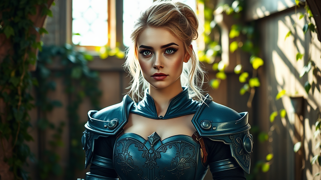 A captivating portrait of a beautiful young woman, a medieval RPG character with an air of mystery. Her blonde hair is styled in an elegant upswept updo, hinting at her swashbuckler rogue persona. She wears a corset shirt under intricately detailed teal armor, the ensemble showcasing both her strength and grace. The setting is indoors, a space overgrown with tendrils of ivy, illuminated by the bright morning light streaming in from the side, casting soft shadows and enhancing her enigmatic allure. Her gaze is focused and determined, hinting at the adventures she has undertaken and those yet to come.