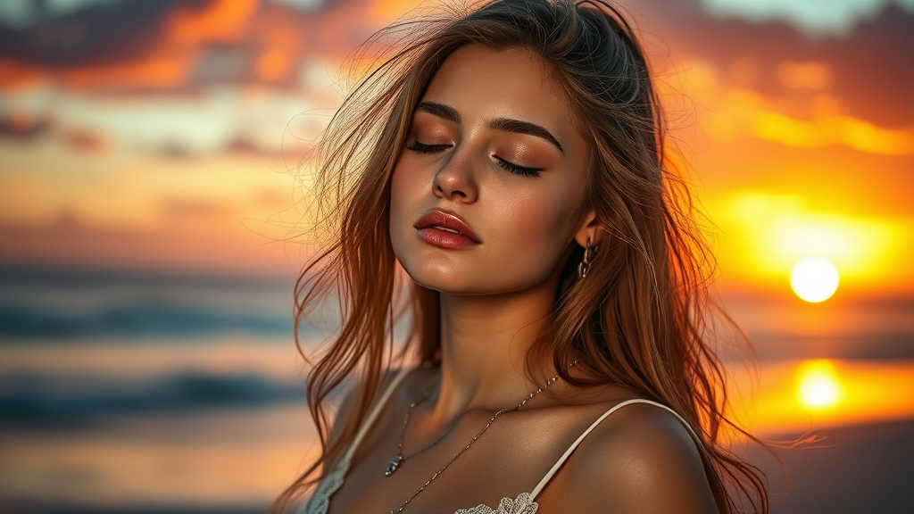 A captivating portrait of a beautiful young woman, with an intricate and elegant fantasy style, captured in detailed, cinematic lighting with a blend of gradient hues. She is in a relaxed pose reminiscent of a cowgirl, her arms casually placed behind her back. Her face is adorned with cute, fine features, and she stands at the beach during a stunning sunset, her eyes gently closed, embodying a moment of serene reflection. The scene is depicted in ultra-high resolution, capturing the essence of a masterpiece.
