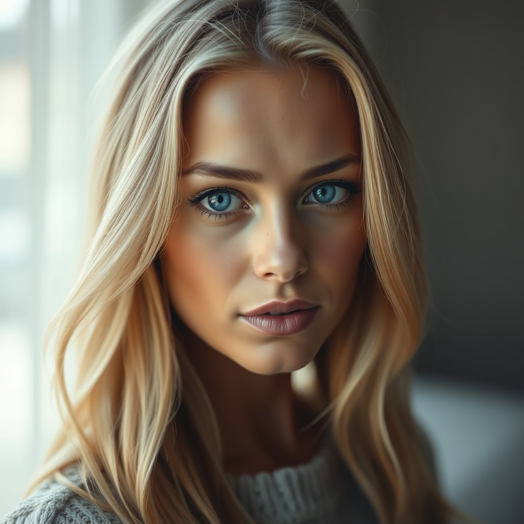 A captivating portrait of a blonde woman with striking blue eyes, embodying natural and timeless beauty, captured in 32k ultra-high-definition with exquisite, blink-and-you-miss-it detail. Photographed using a Voigtlander Bessa R2M, the scene is infused with a harmonious blend of soft orange and gray tones under enchanting lighting. The composition evokes a sense of elegance and grace, offering a glimpse into her serene and compelling presence, perfectly attuned to an aspect ratio of 9:16 with a stylization touch of 750.