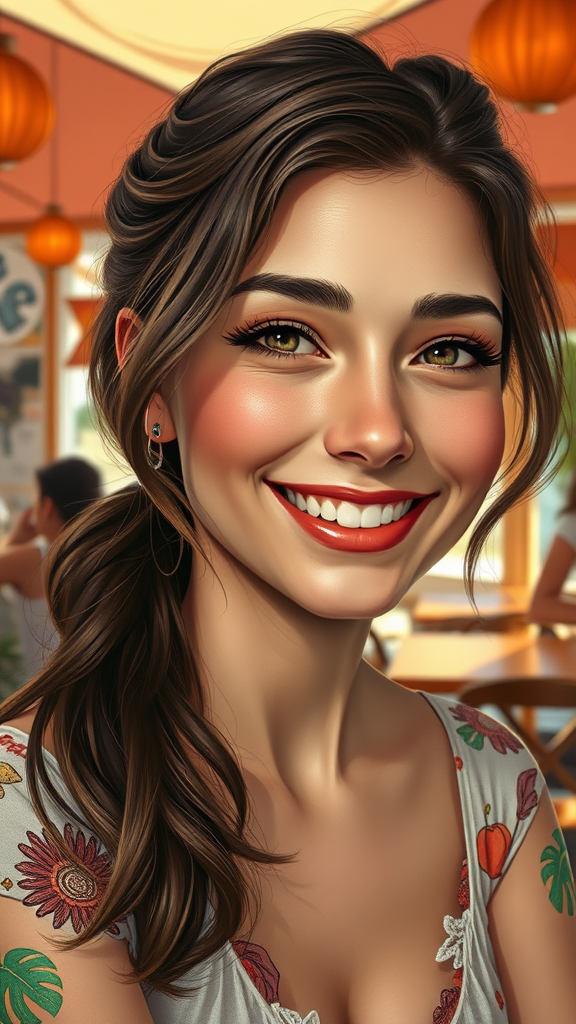 A captivating portrait of a charming brunette with a warm smile, featuring a detailed face set against the lively backdrop of a summer café. Crafted with high attention to detail, this piece reflects concept art in hyperrealism, utilizing cinematic lighting. The digital art painting is inspired by the style of Greg Rutkowski, with slight artistic embellishments. The scene includes playful elements like stickers, markings, and speech bubbles, yet avoids chaotic lines or visual clutter, maintaining a seamless and harmonious composition. Despite being cropped, the image retains a high-resolution quality free of artifacts.