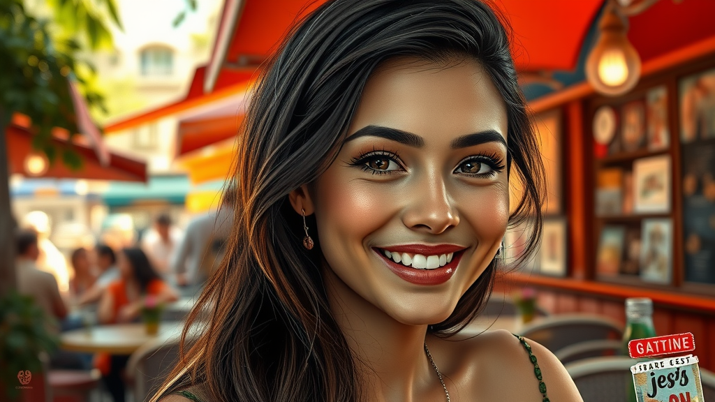 A captivating portrait of a charming brunette with an endearing smile, featuring a detailed face set against the vibrant backdrop of a bustling summer café. The scene is intricately crafted with elements of hyperrealism and concept art, enhanced by cinematic lighting to create a digital art masterpiece reminiscent of Greg Rutkowski's style. The image captures the essence of a lively moment with subtle inclusions of playful elements like stickers, speech bubbles, and markings that add a unique touch.