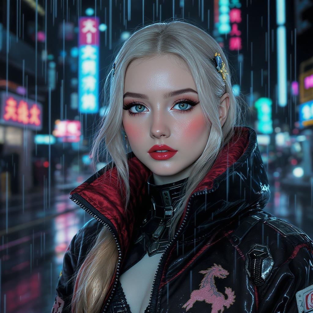 A captivating portrait of a European pretty young girl donning a storm rain movie jacket, blending futuristic sci-fi fashion with royal attire. The style is inspired by artists like Ismail Inceoglu, Dragan Bibin, Hans Thoma, Greg Rutkowski, Alexandros Pyromallis, Nekro, and Rene Magritte. Her face is perfectly structured with a sharp chin and fine details, capturing a pretty and fine-faced aesthetic. The setting draws from cyberpunk influences, featuring a neotokyo and synth-wave ambiance with futuristic, low-emission neon vibes reminiscent of a Blade Runner movie scene. The artwork embodies elements of CGI, 3D modeling, and a blend of doll, cartoon, anime, and illustration techniques. The digital art is meticulously crafted, ensuring clarity and avoiding flaws typically associated with digital renderings. The portrayal maintains realistic anatomy with natural proportions, avoiding exaggerations or distortions. The girl's expression and attire blend seamlessly into the futuristic landscape, creating an evocative and visually stunning depiction.