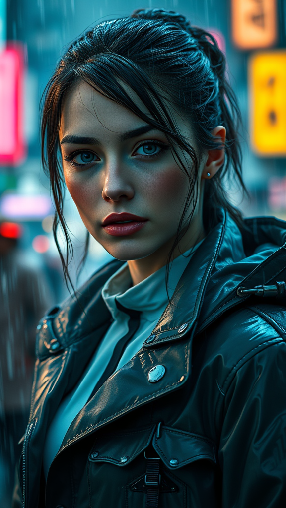 A captivating portrait of a European young woman in a rain-drenched movie scene, wearing a futuristic sci-fi jacket reminiscent of royal attire. The artwork blends influences from Ismail Inceoglu, Dragan Bibin, Hans Thoma, Greg Rutkowski, Alexandros Pyromallis, and Nekro, featuring a perfectly proportioned face with sharp features and intricate detailing. Her expression is enchanting, merging cyberpunk aesthetics with a neo-Tokyo and synthwave flair. The scene is illuminated by low-emission neon lights, capturing a Blade Runner-esque ambiance. The composition maintains a harmonious balance with realistic anatomy and carefully rendered details, emphasizing human beauty intertwined with futuristic fashion. The background echoes a cinematic, high-resolution setting full of depth and ambiance.