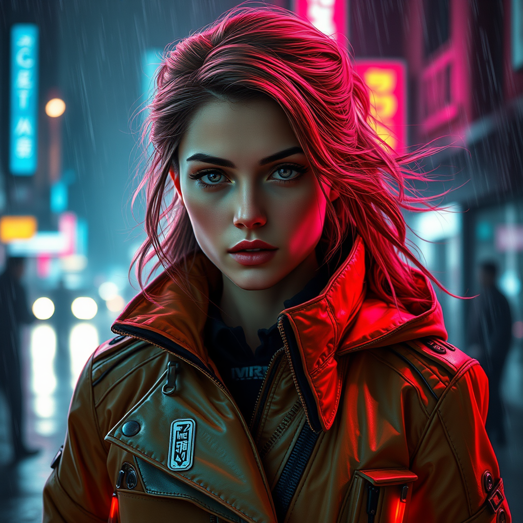 A captivating portrait of a European young woman with a striking presence, adorned in a sleek, futuristic jacket reminiscent of a sci-fi film set in a stormy neon-lit cityscape. Her attire, a unique blend of royal European fashion and cyberpunk aesthetics, features intricate details and rich textures inspired by the works of Ismail Inceoglu and Dragan Bibin. The scene, bathed in the dramatic lighting of a Bladerunner-esque environment, showcases her perfect face with sharp features and captivating eyes, framed by a mane of flowing hair. The jacket, with its bold design and low-emission neon highlights, stands out against the rainy backdrop, creating an atmosphere that is both modern and timeless. The composition boasts ultra-high resolution and hyper-realistic lifelike textures, capturing every nuance and detail of her expression and attire. The mood is enhanced by a blend of synth-wave and neotokyo vibes, with rich colors adding depth to the scene. This sophisticated fusion of realism and artistic flair creates a compelling visual narrative that speaks to both the elegance of royal attire and the edgy allure of futuristic fashion.