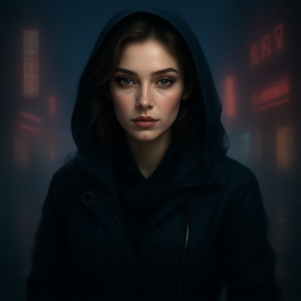 A captivating portrait of a European young woman with an enigmatic expression, wearing a sleek, futuristic rain jacket and coat that blends sci-fi fashion with royal elegance. Inspired by Ismail Inceoglu, Dragan Bibin, Hans Thoma, Greg Rutkowski, Alexandros Pyromallis, and Rene Magritte, the illustration showcases a perfect face with sharp features, realistically shaded with fine details. Set against a cyberpunk, Neo-Tokyo backdrop with synthwave aesthetics, low-emission neon lights evoke a Blade Runner atmosphere. The scene, with its dreamlike royal attire and futuristic elements, is a harmonious blend of realism and imagination, creating an artistic juxtaposition of classical beauty and modern, sci-fi influences.