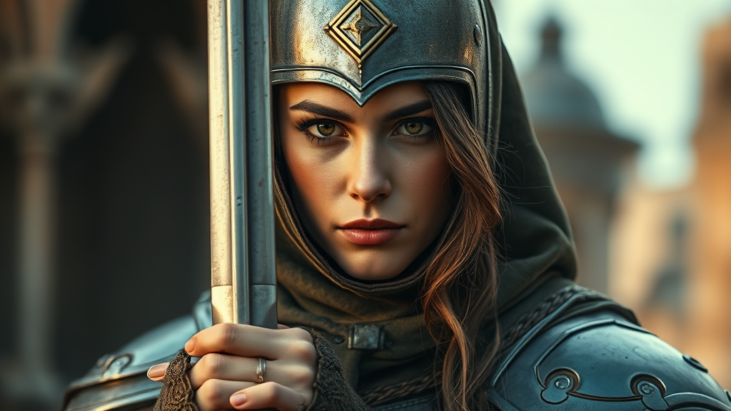 A captivating portrait of a female Knights Templar on a crusade, centered and intricately detailed. Her gaze exudes strength and determination, embodying breathtaking beauty. The scene captures a cinematic essence reminiscent of Karol Bak's style, with a focus on clarity and precision. The background is subtly blurred to enhance the subject's presence, with no distractions like artifacts or signatures. Her armor is meticulously designed, showcasing historical accuracy and artistry. Her hands rest confidently on her sword, demonstrating grace and poise, while her expression reflects both resolve and compassion. The colors are rich and harmonious, with careful attention to lighting and shadow to create depth and dimension.
