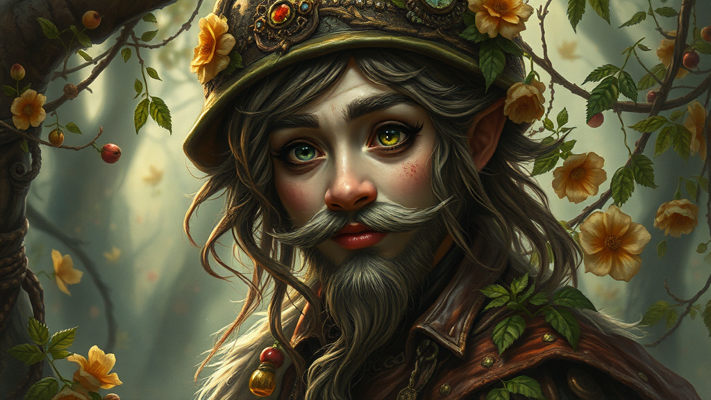 A captivating portrait of a folklore character, such as a cunning trickster with a mischievous gleam in their eyes, or a gentle spirit radiating kindness. The style mimics John Bauer's technique, emphasizing ornate details and a rich, vibrant color palette. The scene is bathed in soft, diffused lighting, lending it an ethereal, dreamlike atmosphere. The character is set against a lush, mystical forest backdrop, where whispers of magic seem to linger in the air. The foliage around them is alive with subtle movement, intertwining with the character's attire to create a seamless blend of nature and fantasy.