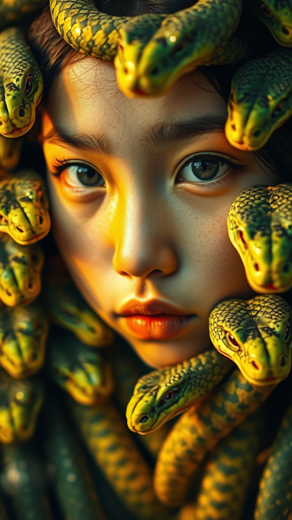A captivating portrait of a girl's enigmatic face surrounded by an array of green and yellow snake faces, blending elements of chinapunk and iconic album cover artistry. The composition features a soft-focus portrait style reminiscent of Luke Fildes, with light amber and silver hues casting an exotic, entrancing glow. Playful yet intense, the image captures a mesmerizing interplay of colors and textures, all set against a vertical aspect ratio of 1:2, embodying a stylized essence that intrigues and captivates.