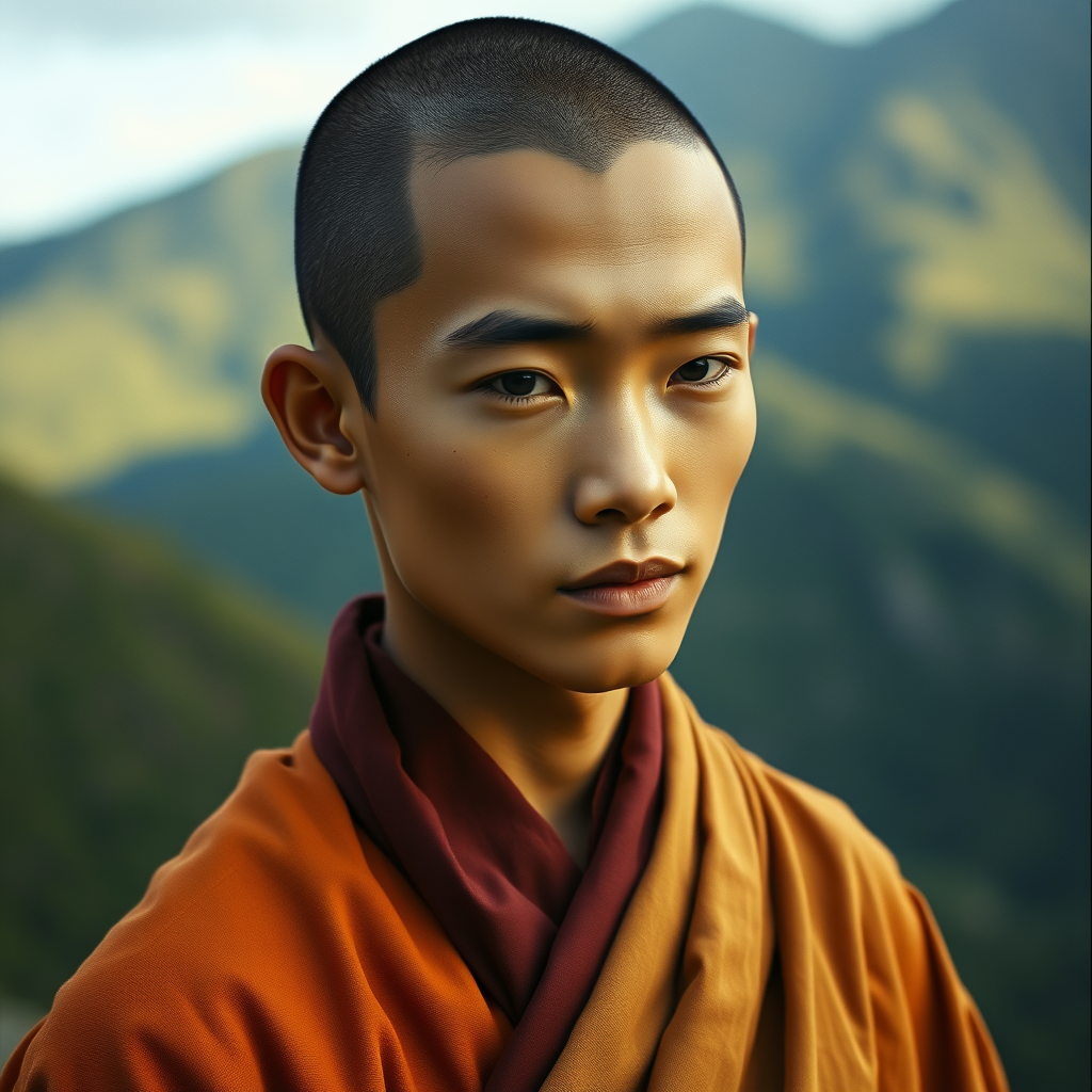 A captivating portrait of a graceful young zen monk, exuding serenity and wisdom, set in a lush mountainous background. The image is sharp and vibrant, captured with cinematic lighting that highlights the monk's tranquil expression. The scene is shot on a 35mm lens with f1.4 aperture using rich Fuji color film, providing a surreal and dreamy quality. The monk's robe gently sways in the breeze, adding a dynamic element, and subtle warm tones enhance the overall tranquility and depth, maintaining the essence of peace and calmness.