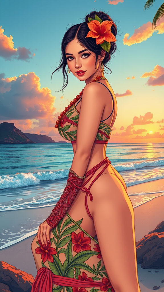 A captivating portrait of a Hawaiian girl on the beach at dawn, adorned in a traditional outfit. The composition is centered, showcasing intricate and highly detailed line work that highlights her breathtaking beauty. With vibrant colors and a comprehensive cinematic quality, the image evokes the styles of Laurie Greasley and James Jean. Despite the tiki lowres influence, the artwork exudes clarity akin to 8k, hdr resolution, yet subtly plays with textures reminiscent of vintage prints—complete with slight jpeg artifacts. While the visual narrative embraces imperfections like subtle text distortions and slight anatomical quirks, these elements contribute to its unique charm. There's an intriguing interaction between reality and artistic interpretation, with the image balanced between being polished and possessing endearing peculiarities.