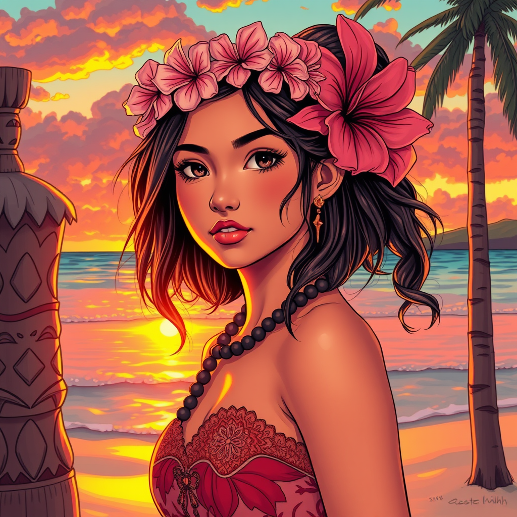 A captivating portrait of a Hawaiian girl on the beach at dawn, wearing a traditional outfit. The composition is centered and intricately detailed, showcasing breathtaking beauty with precise lineart. The scene is vibrant and cinematic, with qualities reminiscent of Laurie Greasley and James Jean's work. The setting includes tiki elements, creating an atmospheric backdrop. Despite the challenges of low resolution, jpeg artifacts, or textual errors, the image manages to maintain its stunning allure. The anatomy of the girl is gracefully rendered, avoiding disfigurements like extra limbs or poorly drawn features. The portrait is devoid of any distracting elements such as watermarks, artist signatures, or copyright texts, ensuring the focus remains on the girl's beauty and the rich cultural ambiance of the Hawaiian beach setting.
