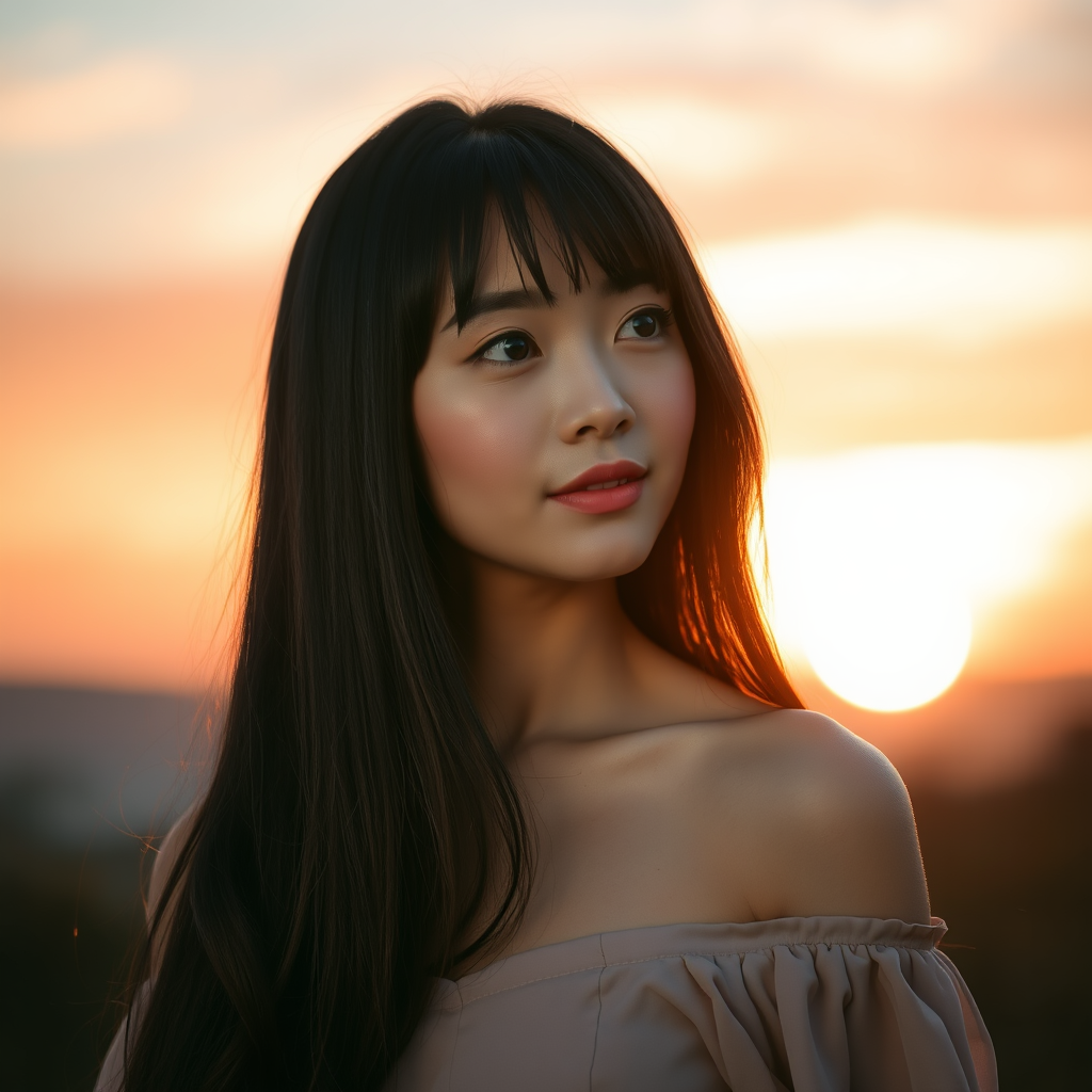 A captivating portrait of a lady with a realistic face, framed by a stunning sunset backdrop. Wearing an elegant off-shoulder dress, her long, straight hair drapes gracefully as she shyly gazes into the distance. Her cheeks show a soft blush, accentuated by her bangs and a gentle head tilt. The image showcases high contrast and sharpness, with masterful use of shadows, capturing a photo of extraordinary quality. Shot in ultra-high resolution, the details are vivid and rich with color, achieved with a Kodak Portra 400 camera and a f1.6 lens. The dramatic lighting adds a layer of intrigue and depth, creating a masterpiece that feels both intimate and evocative.