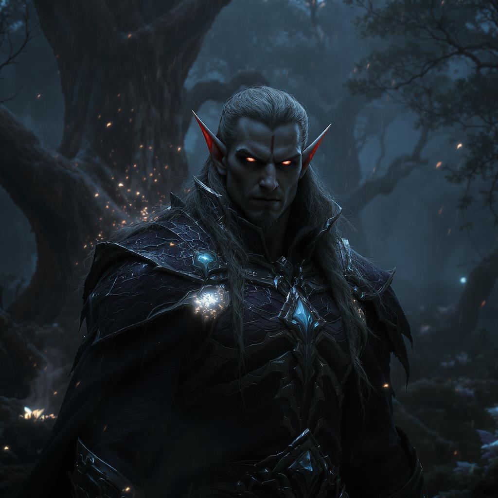 A captivating portrait of a male elf villain in a breathtaking fantasy realm, showcasing ultra quality and cinematic lighting. The scene presents a masterpiece of stunning visuals, highlighting the elf's perfect anatomy and imposing presence. His striking features are set against the backdrop of a mystical forest, where shadows dance among ancient trees illuminated by ethereal light. The atmosphere exudes an aura of mystery and danger, hinting at the elf's sinister intentions, while his flowing robes and intricate armor reflect his regal yet menacing nature.