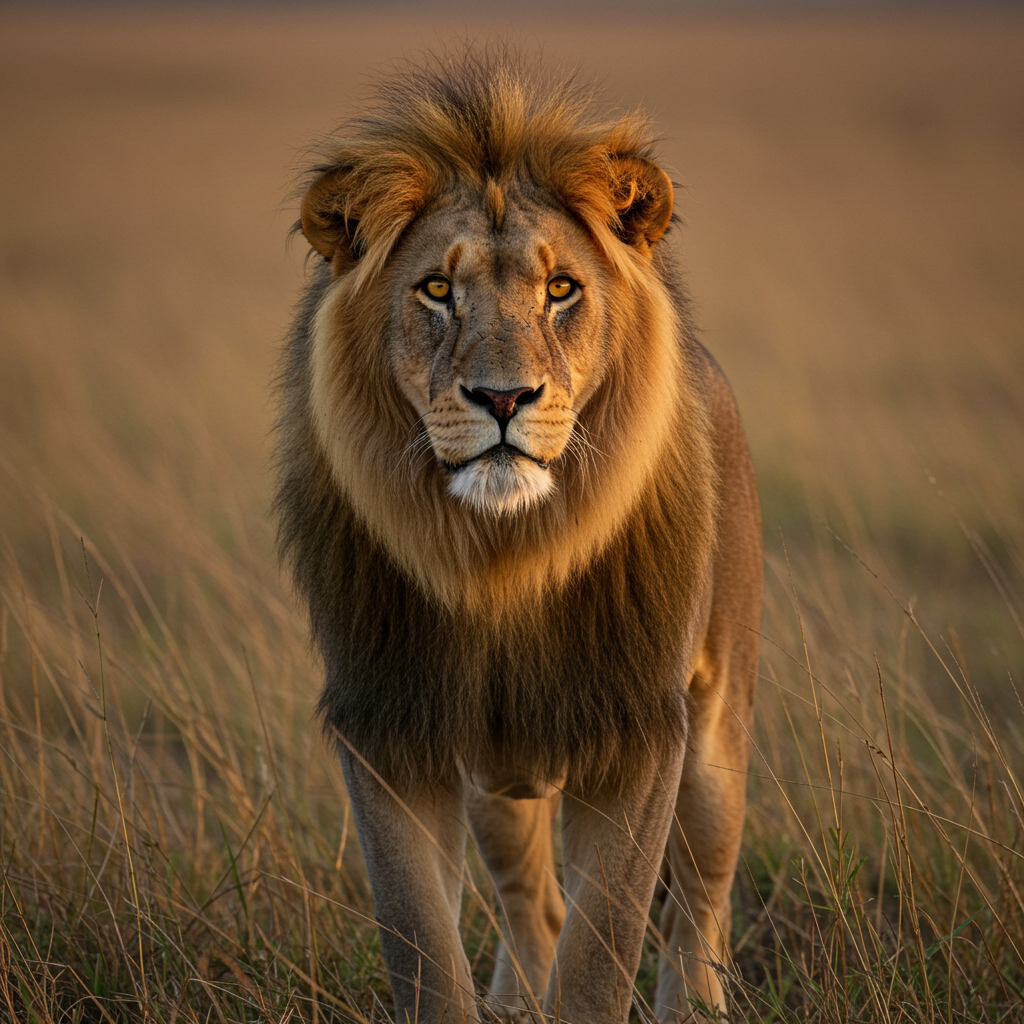 A captivating portrait of a male lion standing proudly in the warm glow of the African savannah. This magnificent predator embodies strength and majesty, his intense yellow eyes gazing boldly into the distance. Framed by a regal mane, its golden tones shimmering in the light, the lion's face is a picture of authority. His powerful physique is poised and energetic, with sleek fur that catches the sun's radiant glow. Captured with precision using a Canon EOS-1D X Mark II DSLR camera and a 300mm f/2.8L IS II USM lens, the image showcases exquisite detail. A resolution of 20.2 megapixels and an ISO of 800 allow for every nuance of the lion's noble features to be visible. Shot in aperture priority mode with an f/2.8 setting, the image achieves a lovely bokeh effect, blurring the background just enough to focus attention on the lion. A shutter speed of 1/1000 sec was used to perfectly freeze the lion's commanding stance. Utilizing a circular polarizing filter, the colors of the sky and savannah are intensified, reducing glare while adding depth and vibrancy. With the lion's penetrating gaze and the dramatic sunset light, the portrait exudes presence and emotion, making it a striking statement piece. Post-processing in Adobe Lightroom and Photoshop focused on refined color grading and enhancing contrast to amplify the lion's inherent beauty, resulting in a hyper-realistic, super-resolution, UHD, DTM, HDR, 8K image. This timeless portrait captures the soul of the African savannah and its most formidable predator, offering a breathtaking and awe-inspiring visual experience.