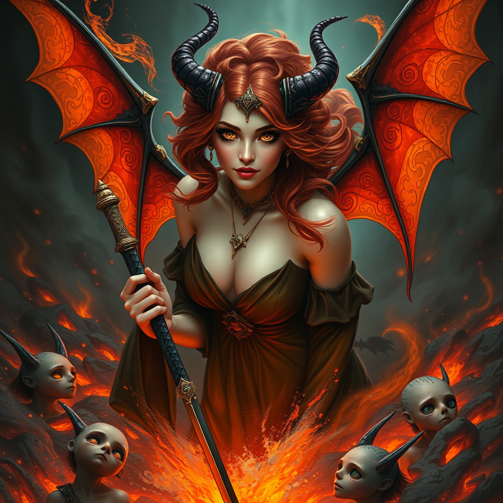 A captivating portrait of a mesmerizing female succubus with bat-like wings and fiery hair, emerging from a bubbling pool of magma and lava. Her face is exquisitely detailed, embodying the essence of fantasy and magic, reminiscent of a dreamy D&D universe. The composition captures her floating effortlessly, surrounded by swirling particle effects, set against a vividly detailed background. The digital painting shines with vibrant fiery colors, showing crisp lighting, and is polished to an artstation-worthy finish. Her attire, a flowing gown adorned with intricate accessories, adds to her allure as she subtly holds her pose with a wand or sword. Amidst this scene, otherworldly figures add depth, though intentionally blurred to keep focus on the succubus. The inspired artistry by masters like Artgerm, Greg Rutkowski, Alphonse Mucha, Loish, and WLOP is evident, aiming for photorealism in 8k quality, captivating enough to trend on platforms like Tumblr. Despite the presence of additional figures, care is taken to avoid grotesque depictions, ensuring the main character remains both striking and ethereal.