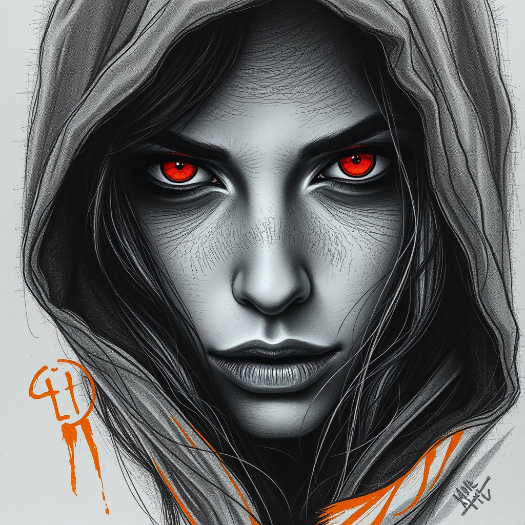 A captivating portrait of a mysterious woman with intense red eyes hidden beneath a shadowy hood, rendered in detailed penciling reminiscent of Raphael Lacoste's style. Her features are highlighted with dark silver and orange tones, invoking the artistic essence of Marc Silvestri and Ingrid Baars. The composition is a series of emotionally charged sketches, capturing the enigmatic allure of her gaze. The artwork, long and narrow, frames her in a unique 1:2 aspect ratio, exuding a stylized and evocative aura.