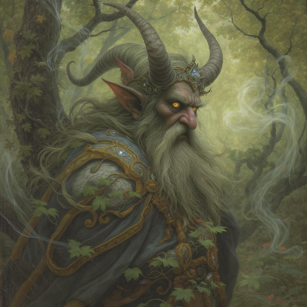 A captivating portrait of a mythical folklore character, perhaps a cunning trickster or a kind-hearted woodland spirit, presented in a style reminiscent of John Bauer's art. The character is surrounded by lush, verdant foliage that hints at an enchanted forest setting. Their attire is elaborately detailed, with swirling patterns and vibrant hues, evoking a sense of whimsy and magic. Soft, diffused lighting bathes the scene, enveloping the character in a gentle, dreamy aura that blurs the lines between reality and fantasy, while a faint, luminous mist winds through the background, enhancing the mystical atmosphere.