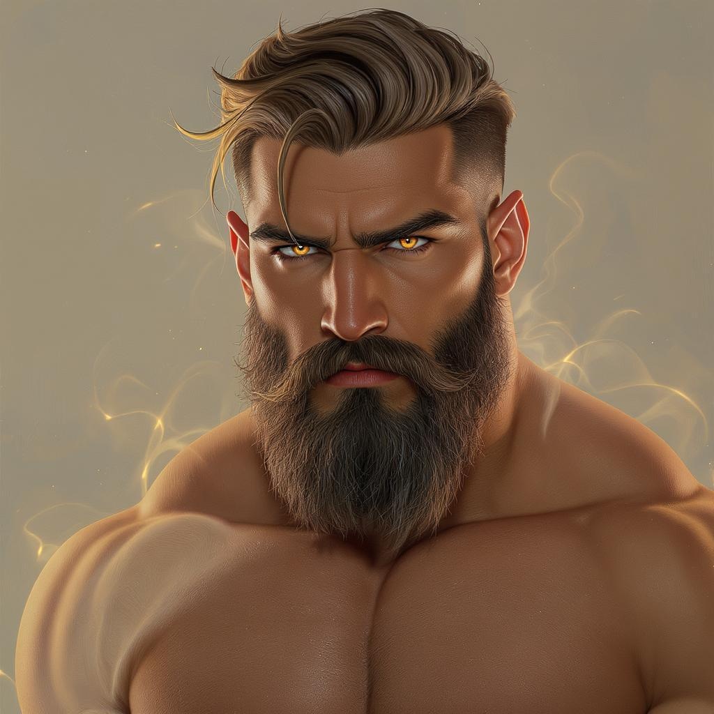A captivating portrait of a ruggedly handsome, bearded man with striking hazel eyes, exuding strength and elegance. His muscular build is highlighted by a soft, glowing light that adds depth and dimension to the scene. The digital painting is highly detailed, showcasing intricate features and textures. The artwork is reminiscent of styles seen on ArtStation, featuring concept art and smooth, sharp focus. Influences of renowned artists are evident, blending the elegance of WLOP, the dynamic flair of Mars Ravelo, and the intricate detailing of Greg Rutkowski, creating an enchanting and unique illustration.