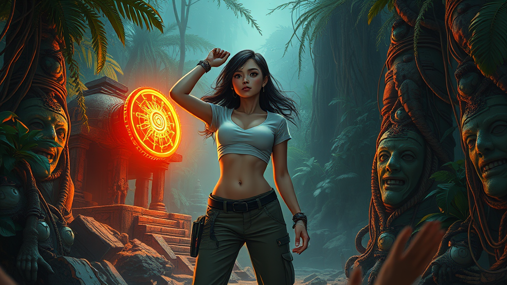 A captivating portrait of a slender woman with defined abs and small breasts, dressed in a tomb explorer outfit with long pants and a midriff-baring t-shirt. She uncovers an extraterrestrial engine, which bursts into vivid hues as it illuminates, amidst her excavation of elaborate ancient ruins hidden deep within a lush jungle. Dramatic lighting enhances the scene, capturing every intricate detail in stunning 10k high resolution. Asian-Less-Neg bad-artist bad-artist-anime bad-hands-5 bad_pictures bad_prompt_version2 badhandv4 By bad artist -neg CyberRealistic_Negative-neg EasyNegative negative_hand-neg ng_deepnegative_v1_75t verybadimagenegative_v1. 3, lowres, text, error, cropped, worst quality, low quality, jpeg artifacts, ugly, duplicate, morbid, mutilated, out of frame, extra fingers, mutated hands, poorly drawn hands, poorly drawn face, mutation, deformed, blurry, dehydrated, bad anatomy, bad proportions, extra limbs, cloned face, disfigured, gross proportions, malformed limbs, missing arms, missing legs, extra arms, extra legs, fused fingers, too many fingers, long neck, username, watermark, signature.
