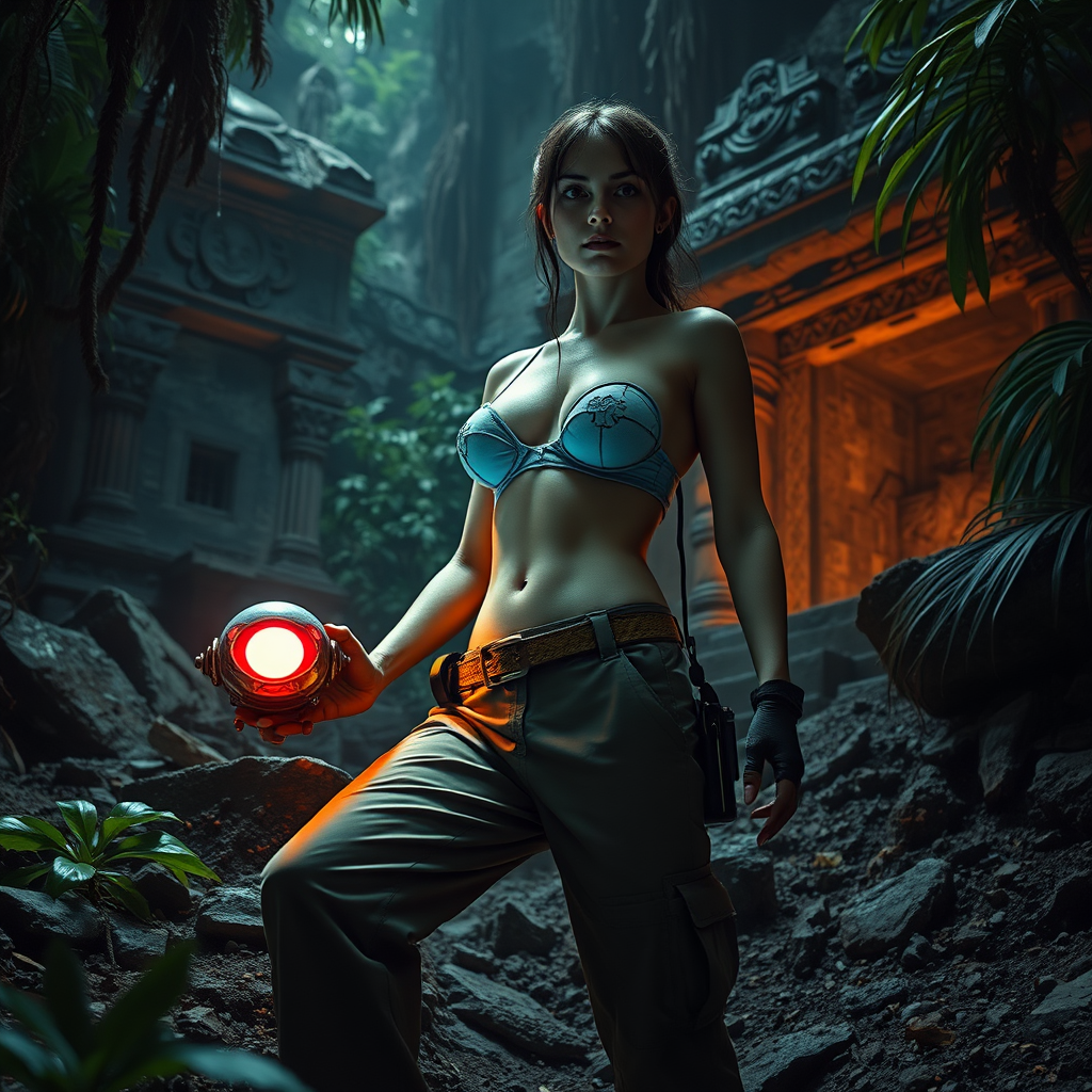 A captivating portrait of a slim woman with toned abs and petite breasts, dressed in a tomb explorer ensemble consisting of long pants and a midriff-baring t-shirt. She unearths a luminescent extraterrestrial engine that begins to emit vibrant colors as she excavates among the elaborate ancient ruins hidden deep within the lush jungle. The use of dramatic lighting enhances the depth of the scene while capturing every intricate detail in breathtaking 10k high resolution.