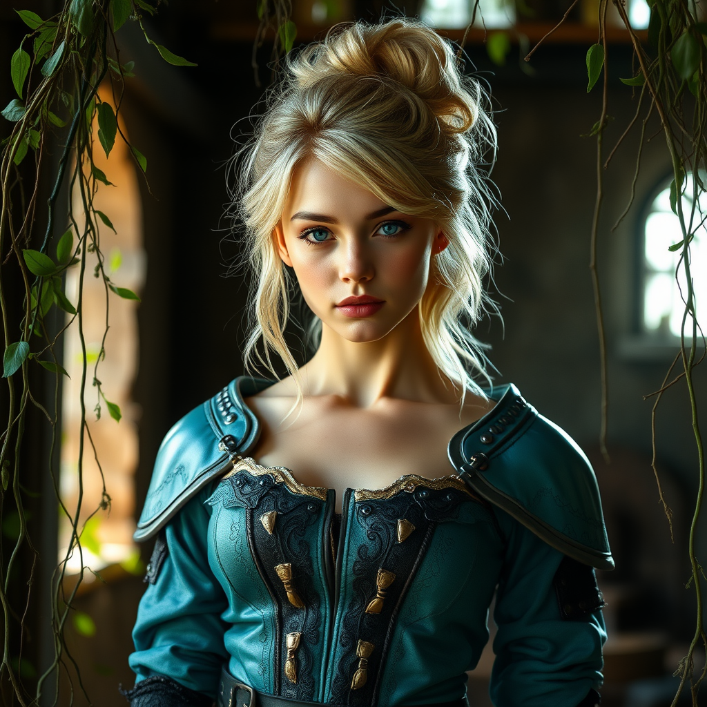 A captivating portrait of a solitary, beautiful girl within a medieval RPG setting. She is a swashbuckler rogue with an upswept updo of blonde hair, exuding an air of mystery and elegance. Her attire comprises a corset shirt paired with teal-hued armor, intricately designed to blend style with functionality. Set indoors, she stands amidst a setting that's overgrown with nature's tendrils, as bright morning light casts a gentle glow from the side, highlighting her determined expression and poised stance.
