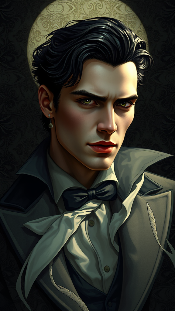 A captivating portrait of a sophisticated and alluring dark bohemian vampire, a male figure exuding an air of ennui. The illustration features dramatic lighting and meticulously crafted soft details, evoking the texture of oil painting on canvas. Embracing the elegance of art nouveau, the piece is rendered with the precision of octane render in HDR, presented in stunning 4k and 8k HD quality. Inspired by the styles of Edmund Blair Leighton, Brom, and Charlie Bowater, and trending on artstation, the face bears the haunting allure of Tom Bagshaw's work, with a touch of Sargent's iconic portraiture. The vampire is draped in luxurious, flowing attire, surrounded by an intricate pattern that adds depth to the composition, making the image both timeless and contemporary.