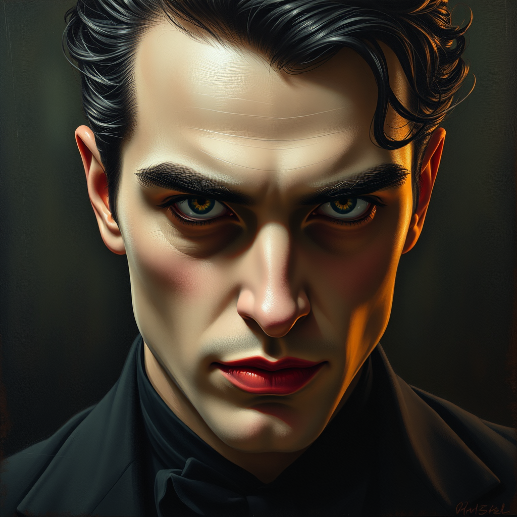 A captivating portrait of a sophisticated and handsome vampire with a dark bohemian aura, exuding a sense of ennui. The male figure is portrayed with rich, dramatic lighting that enhances the soft details of the composition. This oil on canvas painting is infused with art nouveau influences and rendered with an octane technique, resulting in a high-definition, ultra-detailed piece in 4k and 8k resolution. The styles of Edmund Blair Leighton, Brom, and Charlie Bowater merge seamlessly, reflecting contemporary trends as seen on Artstation. The facial depiction draws inspiration from Tom Bagshaw and John Singer Sargent, creating an intriguing interplay of classic and modern artistic techniques.